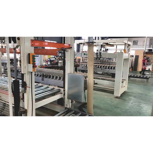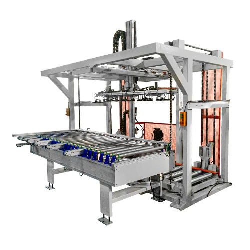 Пакет деталей перемещается в зону загрузчки. Вакуумный загрузчик с присосками поочередно снимает один слой заготовок и перемещает на роликовый транспортер для последовательной подачи деталей в станок для обработки. Система может загружать и разгружать как одну, так и несколько панелей в один и в два ряда.